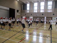 低学年(1〜3年生)と高学年(4〜6年生)が日替わりで、中休みの校庭で音楽に合わせて走っています。