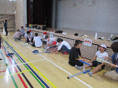 体育館では、長座体前屈と反復横跳び、上体起こしを行いました。