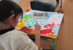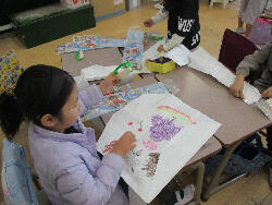2年生の図工では2学期の終わりに刷った紙版画の仕上げをしました。