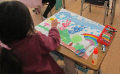 今日は、凧にクレヨンで絵を描き、凧糸を結びました。