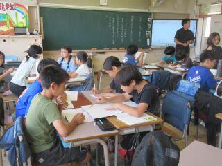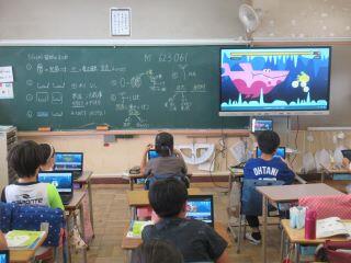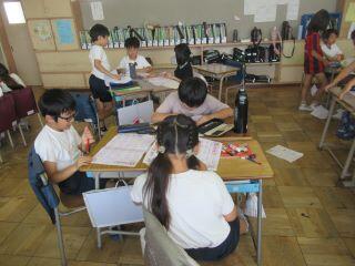 続いて4年生の社会と算数の授業の様子です。社会の授業では、これまで学習してきた小笠原の自然や暮らしについて各自がまとめる活動を進めていました。また算数の授業では、今日も分数の計算の仕方を考え発表する課題に取り組んでいました。