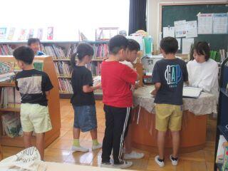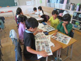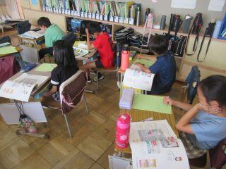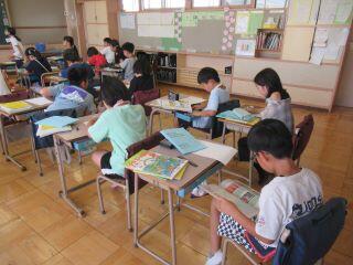 続いて3年生と4年生の図書室での様子です。3年生は小学生新聞を読んでいました。図書支援員さんからのクイズもあったようです。4年生も読みたい本を一生懸命に探し、熱心に読書をしていました。