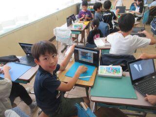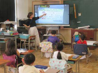 続いて1年生・2年生の授業の様子です。1年生の道徳の授業では、「きんのおの」のお話を通して「正直」について考えていました。また同じく1年生の国語の授業では、今日もカタカナの練習に取り組んでいました。来週からは漢字の学習も始まるようです。頑張れ1年生! 2年生はタブレットを活用して楽しそうに活動したり、曲を聞いて感じたことを発表したりしていました。