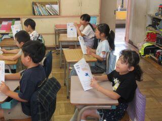 1年生の国語の授業では、ワークシートを持って友達と意見の交流をしていました。「僕はこう考えたよ。ここに印をつけたよ。」と上手に伝え合う姿に感心しました!