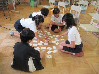 続いて授業の様子です。5年生の外国語の授業では、隣の友達とペアになり、ALTの先生の言葉を聞いて反応の速さを競い合っていました。また6年生の音楽の授業では、記号や音符の名前をカルタにして覚えていました。(私も少し挑戦してきました)