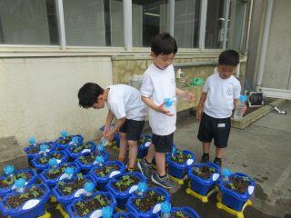 まずは1年生の様子です。朝は、アサガオの水やりをがんばっていました。順調に芽が出て育っています。みんなが忘れずにしっかり世話をしているからですね。算数の授業では、今日も楽しそうに学習している姿が見られました。隣の友達とペアになって、お互いが出した指の数の違い(差)を答え合っていました。
