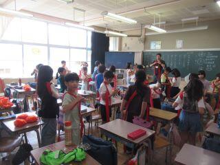 続いて3年生と4年生の様子です。3年生の理科の授業では、今日もモンシロチョウのさなぎを観察していました。先日と色が変わっていることを子ども達が教えてくれました。4年生の教室では、運動会のために「たすき掛け」を練習していました。なかなか苦戦していて、「校長先生、教えて!」「校長先生、これでいいの?」など次々と子ども達から呼ばれました。