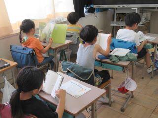 続いて教習での学習の様子です。1年生の国語の授業では、教科書を見て気づくことを友達と探していました。また2年生は図書室で、支援員の先生から図書室の利用についていろいろ教えてもらっていました。
