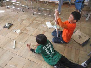2年生の教室では、子ども達が生活科の授業で作ったおもちゃで、楽しそうに遊んでいる姿が見られました。
