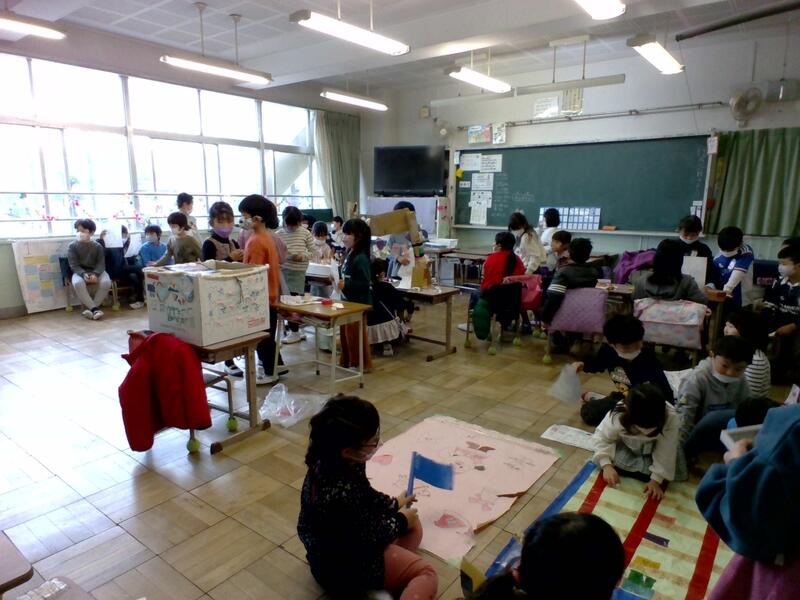 細田先生に教えてもらいました。今回の学習のテーマは、「color」でした。ALTのマヤ先生とも一緒に楽しく学習しました。イングリッシュルームでの学習も新鮮で、意欲的に学習を進められました。
