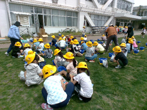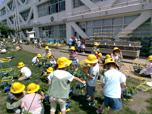 生活科の学習でアサガオのたねをまきました。良い天気の中、校庭の芝生の上で学習しました。自分の鉢を受け取り、土の量や肥料の混ぜ方に気を付けながら、丁寧に作業を進めました。最後にやさしく水をやって、これからの生長を願いました。これから大切に育てていきたいと考えています。