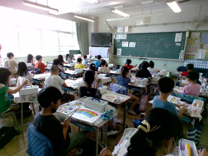 図工の時間に絵の具を使って学習をしています。道具の使い方などを確認しながら学習しています。今週のテーマは「虹」でした。赤、黄、青の3色を使って、思い思いの虹を表現しました。素敵な作品が出来上がりました。