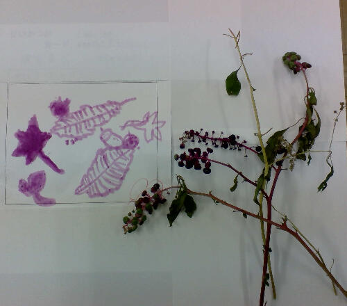 秋の自然を楽しむ学習を始めました。シュヤマゴボウという実を使って、秋の葉や実を描きました。実を綿棒で潰すとインクのようにきれいな色がつきました。