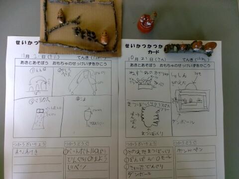 どんぐりや松ぼっくりを使ったおもちゃ作りの計画を立てました。図をかいたり、使う材料や道具を確認したりしました。