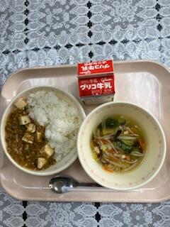 今日の給食の献立は、麻婆豆腐丼 こめこ麺のスープ です。
