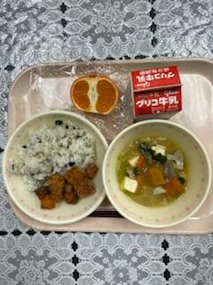 今日の献立は、わかめご飯 サケのゆず唐揚げ 冬至豚汁