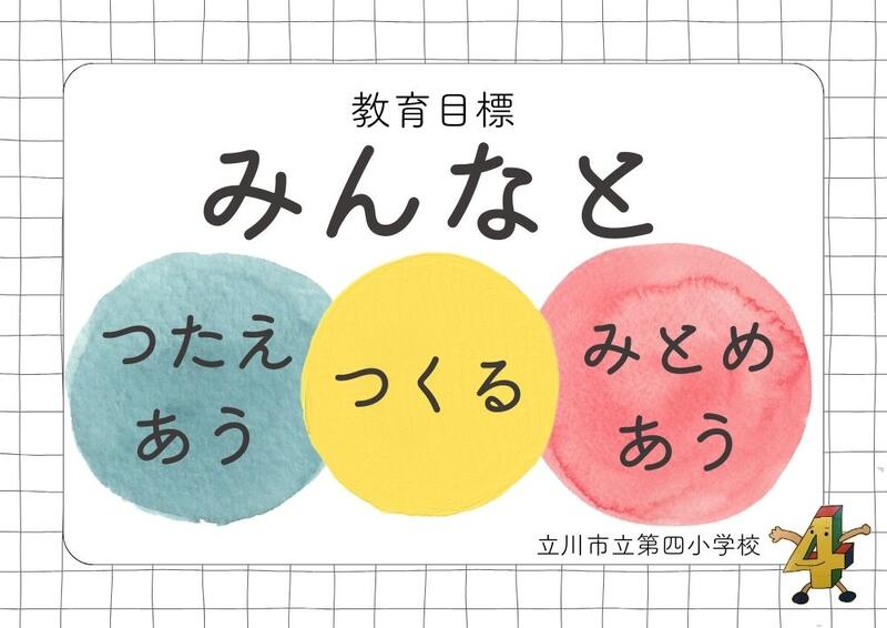 「みんなでつくる学校」を目指します。 今年度も校長として第四小学校で勤務します、浅尾 文(あさお あや)です。どうぞよろしくお願いいたします。第四小学校は、昨年度より学校教育目標を変更し、全児童が「なりたい姿」としてその目標に向かって進んできました。 昨年度は「みんなとつくる」を重点目標とし、楽しい学校も仲良しも自分たちでつくっていくものという意識が育ちました。運動会、学芸会、6年生を送る会など、子供たちのアイディアが生かされ、「自分たちでつくった」という達成感を得ました。自分たちでつくるということが当たり前のようになり、90%の児童が学校は自分たちでつくっている、と思っていることも分かりました。 ◯みんなとつくる ◎みんなとつたえあう ◯みんなとみとめあう しかし、子供たちが振り返りをしたところ、自分たちの課題は「みんなとつたえあう」だということも分かりました。どの学年も同じような結果でした。そこで、今年度は「みんなとつたえあう」ことを重点目標とし、たくさん人と関わりながら自分の考えや気持ちを伝える子供たちになってほしいと思います。「自分たちでつくるんだ、やるんだ」ということが当たり前になっている子供たち。きっと、課題に向かって自分たちで考えて取り組んでいくことでしょう。そんな子供たちの想いが形になるよう、精一杯サポートしてまいります。 「仲良しはつくっていくもの。楽しいクラスや学校はつくっていくもの。」