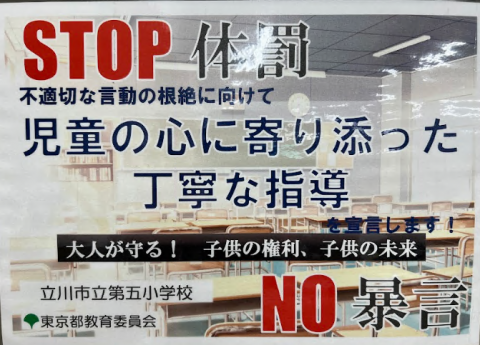 東京都教育委員会では、「都内の全公立学校から体罰の根絶を図る」ことを目的に、7月8月を体罰防止月間として位置付け、都内全公立学校における体罰の根絶の取組をおこなっています。第五小学校でも、その趣旨に従い、体罰の根絶に向けた取組を実施しました。