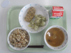 栗とシメジのご飯、イカの磯辺揚げ、モヤシとササミの和え物、十五夜汁、牛乳