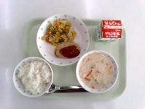 今日は、リクエスト給食です。第三小学校6年2組と、第八小学校6年1組がリクエストしてくれたのは「コーヒー牛乳」です。今日は、「コーンポタージュ」に入っているトウモロコシについてお話します。皆さんは、トウモロコシの名前の由来を知っていますか。日本に伝わったときに、モロコシという中国から伝わった食べ物に似ていることから、昔の中国の王朝である「唐」のモロコシと呼ばれるようになり、今のトウモロコシと言われるようになったそうです。また、トウモロコシは、地方によって、いろいろな呼び方がります。北海道や福井県ではトウキビ、宮城県や茨城県ではトウミギ、岐阜県ではトウナワと呼ばれています。「ほかの呼び方もあるのかな。」と気になった人は調べてみましょう。