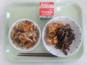 今日は、リクエスト給食です。第二小学校の6年1組がリクエストしてくれたのは、「ひき肉としらたきのピリ辛丼」です。ニンニクや生姜を油で熱し、いい香りがしてきたところに、豚ひき肉を入れて炒め、しらたきを加えて、ピリッと甘辛く味付けしました。しらたきをジャガイモや大根に変えても美味しくできます。今日は、具材をご飯にかけて食べてください。