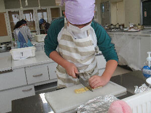 ビスキュイとは、フランス語で「二度焼きしたもの」という意味で、「ビスケット」の言葉の元になっています。給食では、丸パンにココア味のビスケット生地をのせて焼いています。