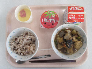 胡麻ご飯、さばのネギ味噌煮、生揚げのチリソース煮、巨峰、牛乳