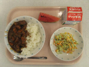 カレーライス、アルファベットスープ、コールスローサラダ、牛乳