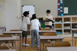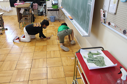 *3年生はモンシロチョウの学習をしています。配膳台の上のキャベツの葉にはモンシロチョウの卵と赤ちゃんが昨日からいるんだよと教えてくれました。一晩教室にいたんだねと話をしたら、もしかして・・・、床に移動しているかも・・・と虫眼鏡で床の上を探してくれていました。