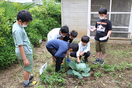 *畑に植えてあるキャベツにモンシロチョウの卵がないか三年生が探していました。そこに「どれどれ」と4年生も一緒に探しはじめました。去年、学習したことを活かしてアドバイスをしていました。