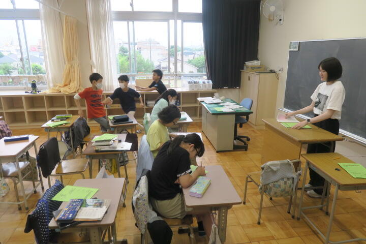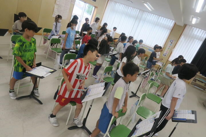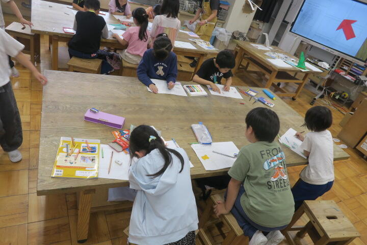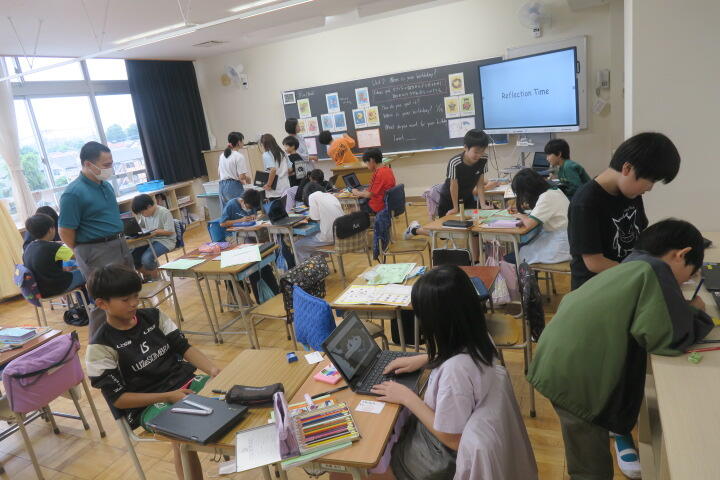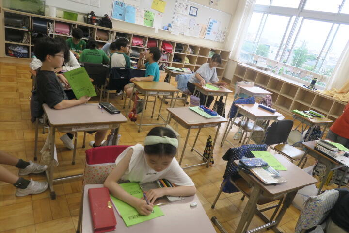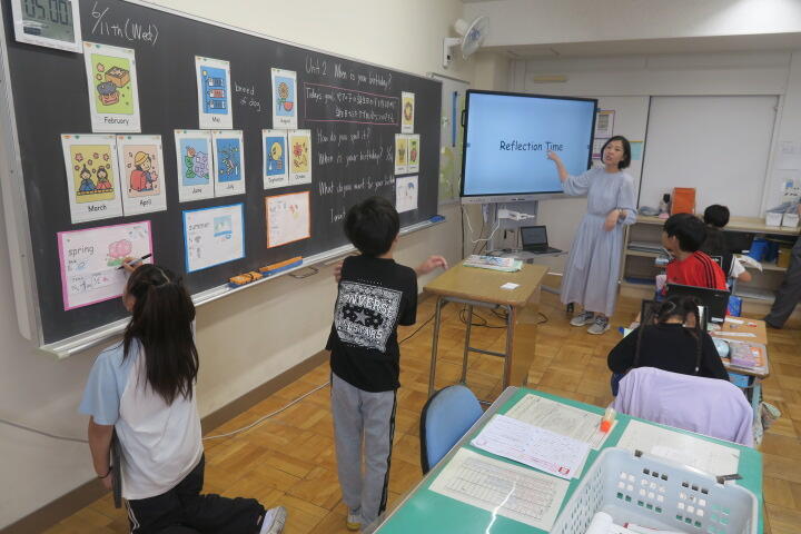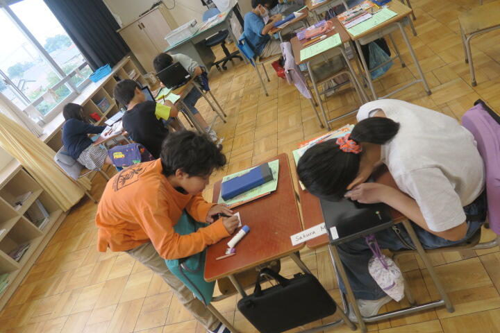 4年生の外国語活動は自己紹介カードを書く学習です。