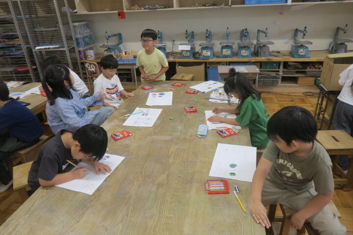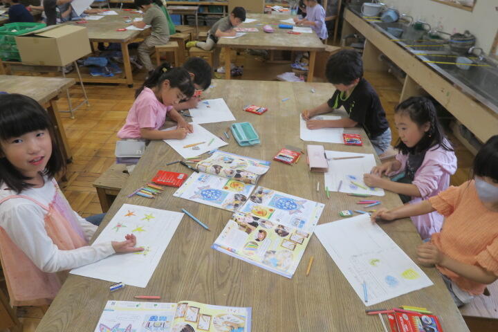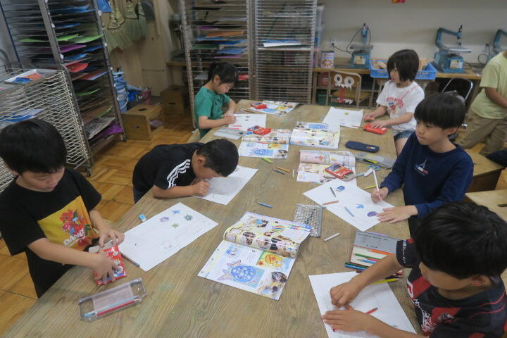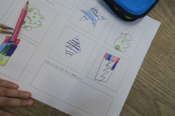 透明シートに自画像を描き、背景にそれぞれ自分の好きなものなどを描いていました。