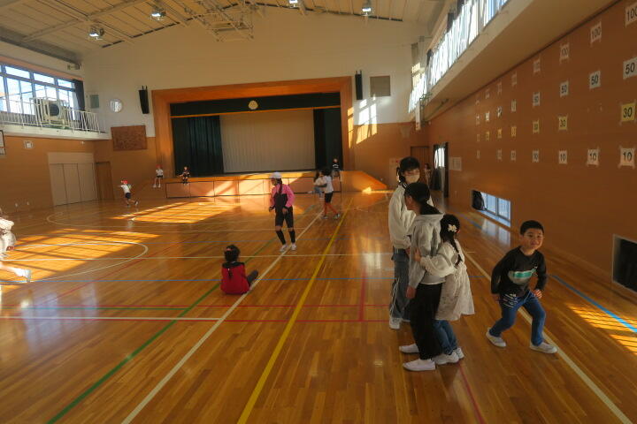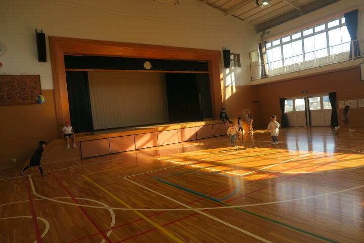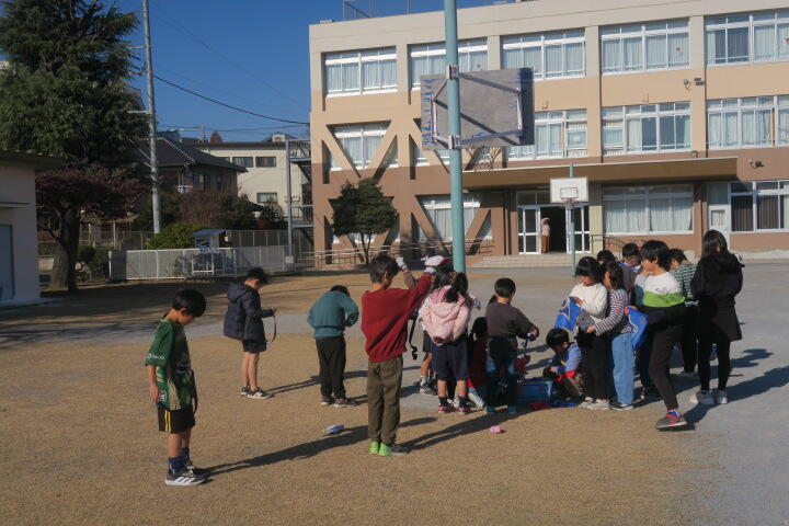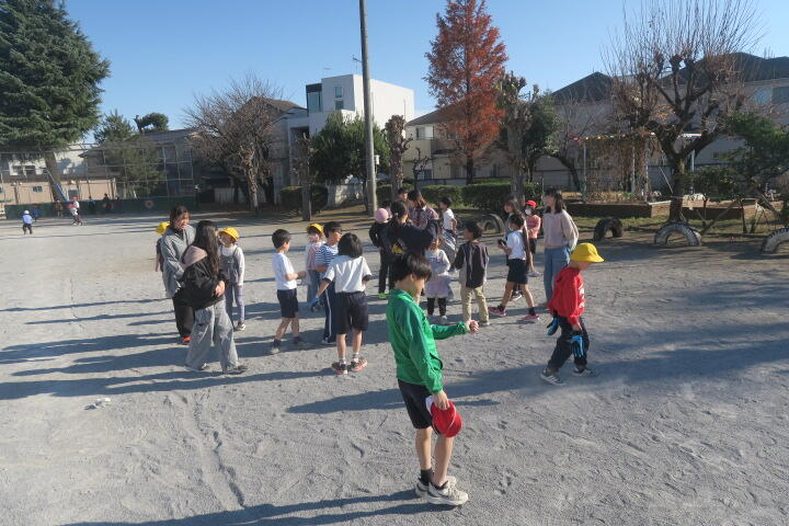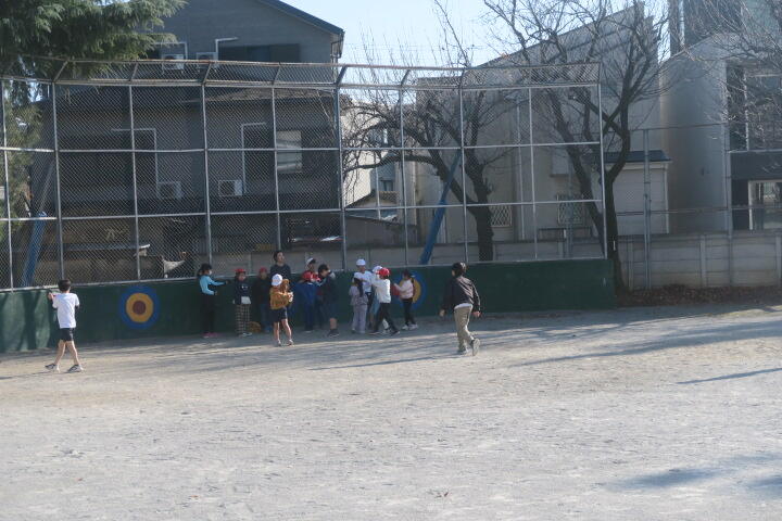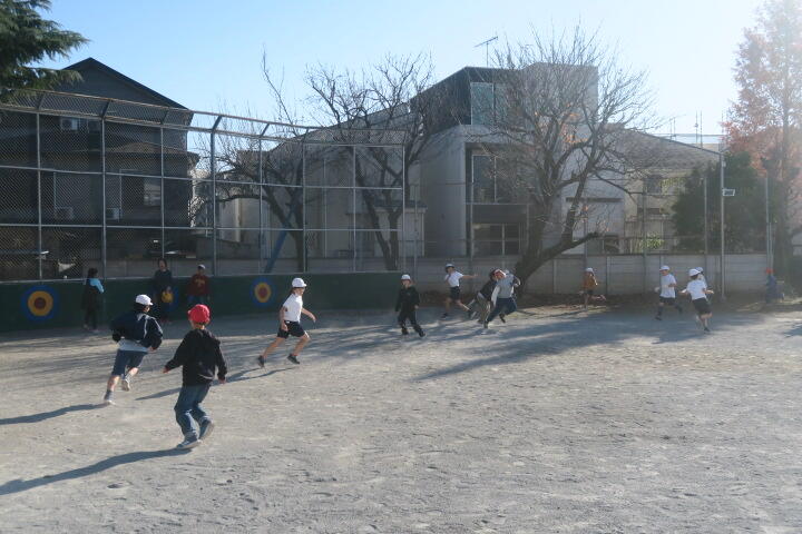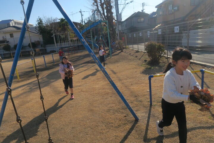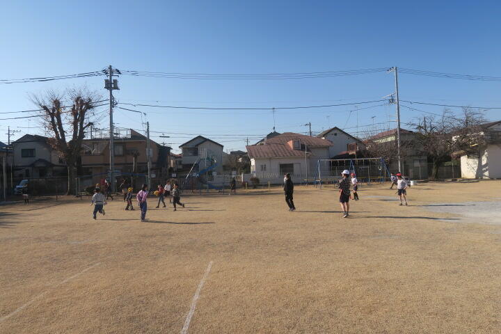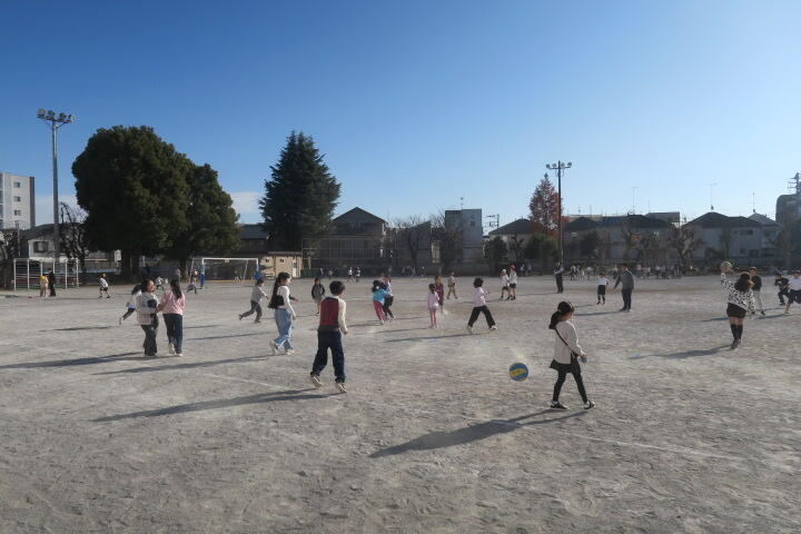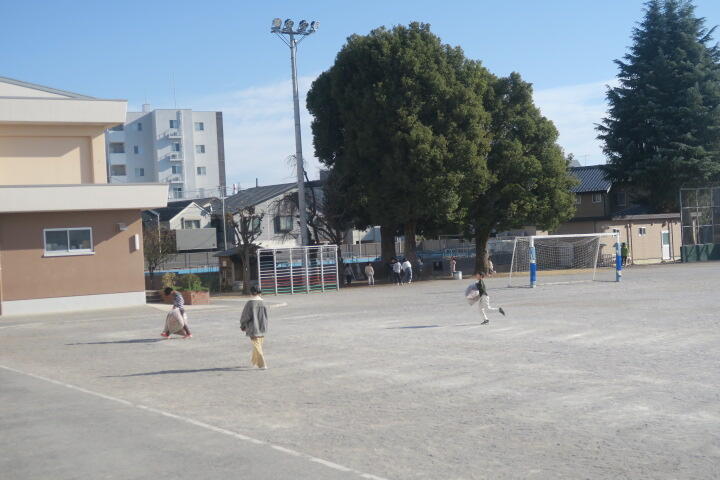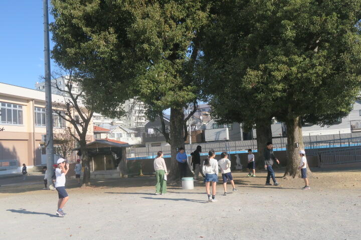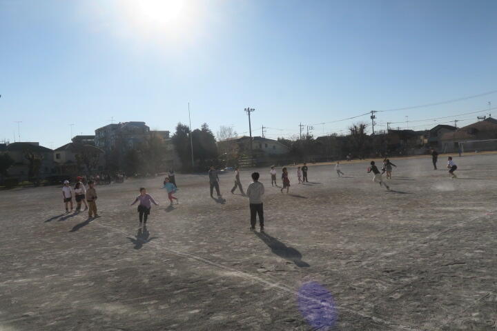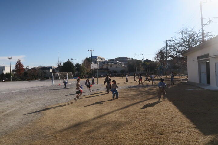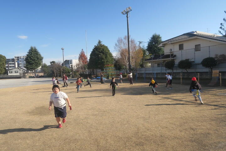 落ち葉掃きの後はてて割班ごとに校庭や体育館で遊びました。
