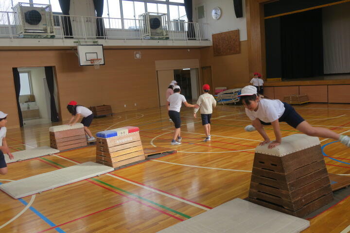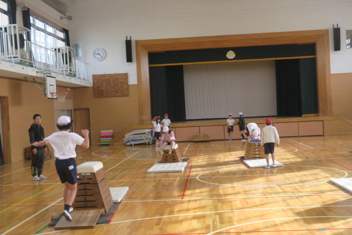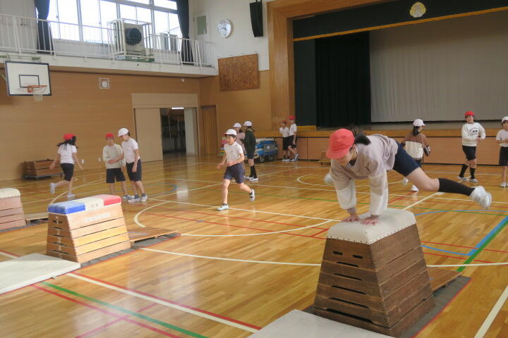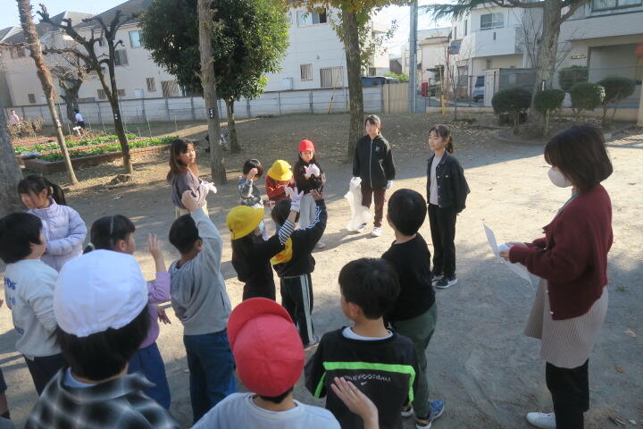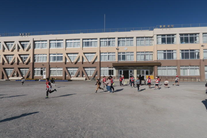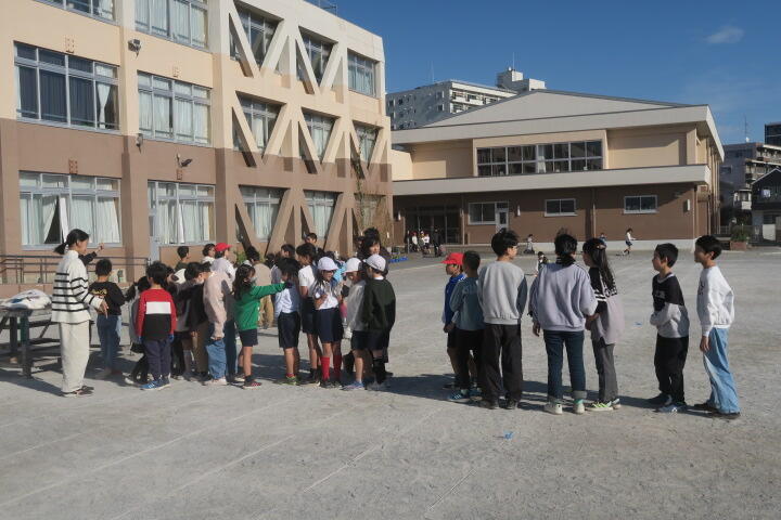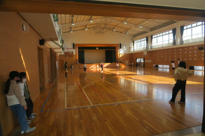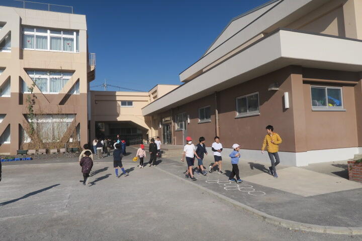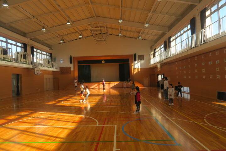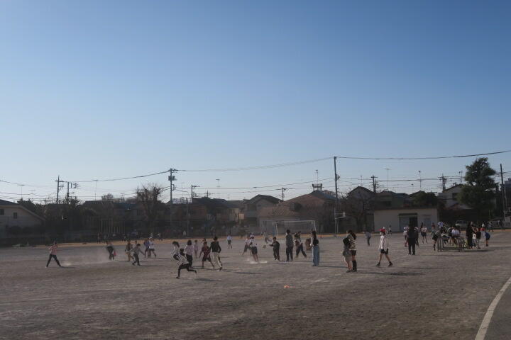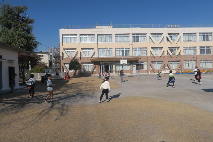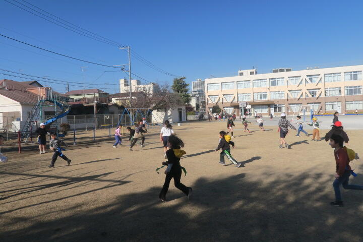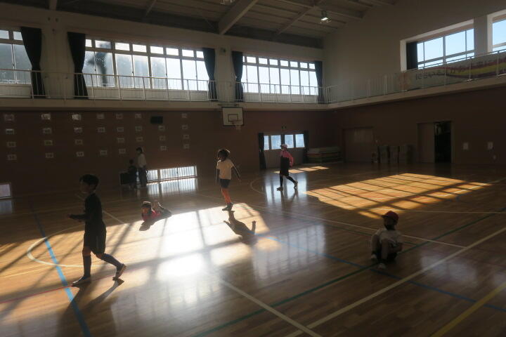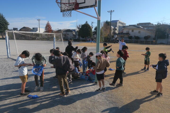 落ち葉掃きの後はてて割班ごとに校庭や体育館で遊びました。