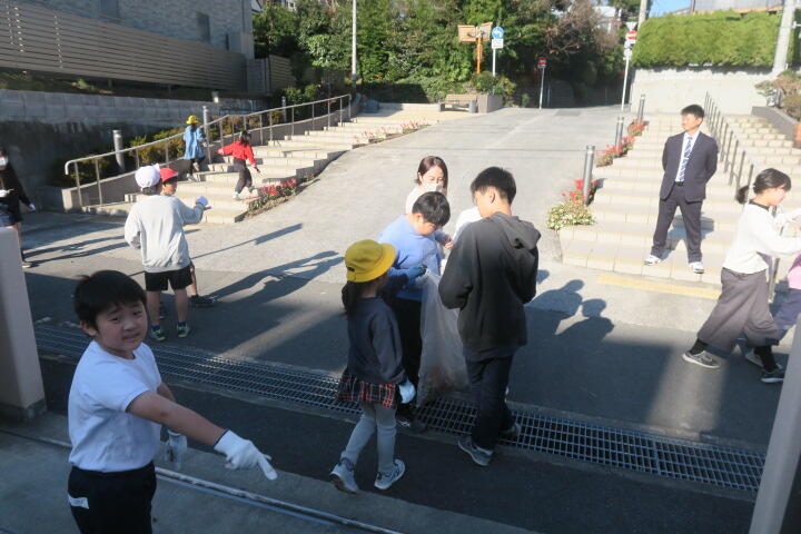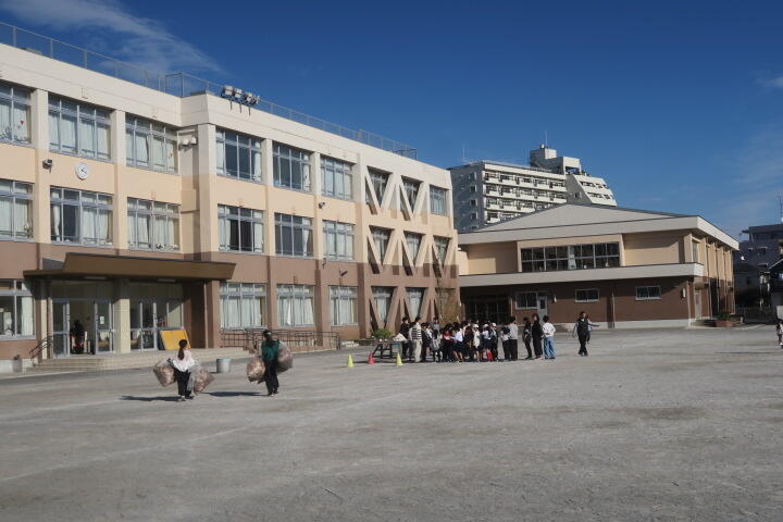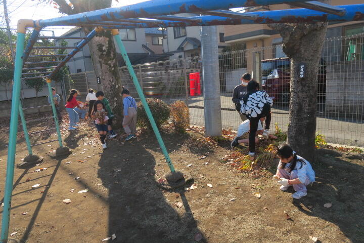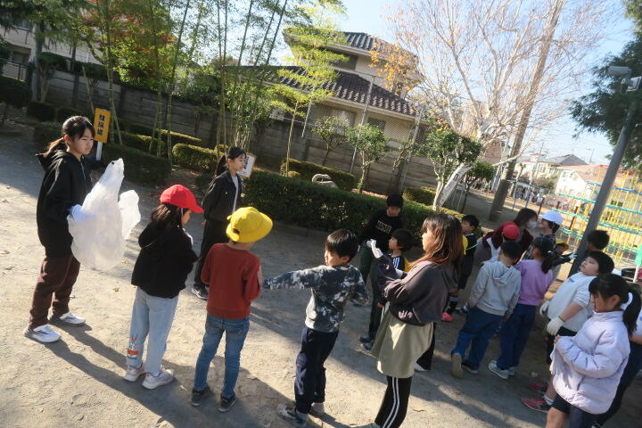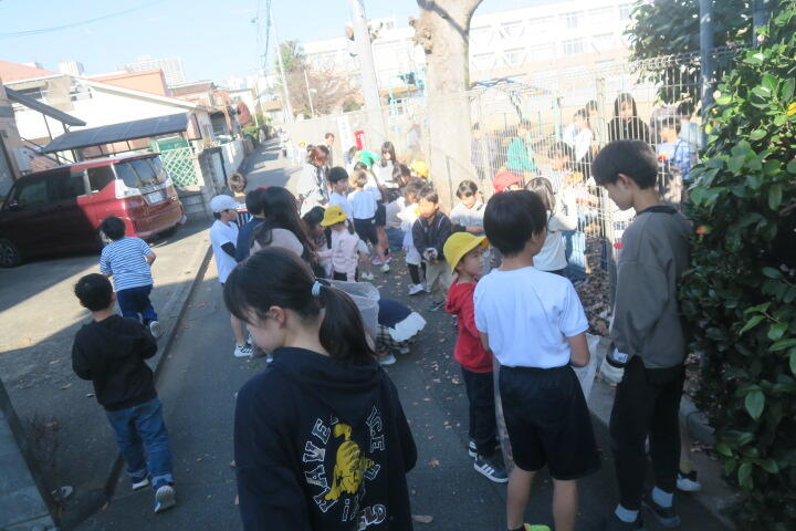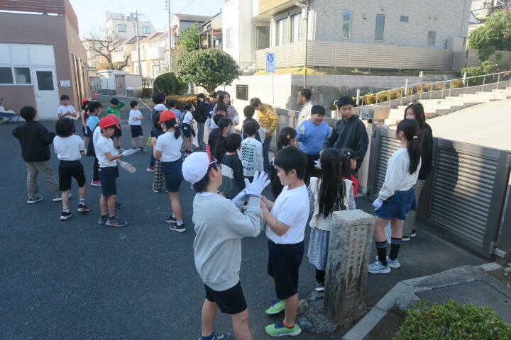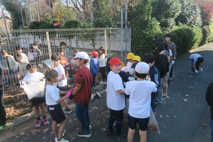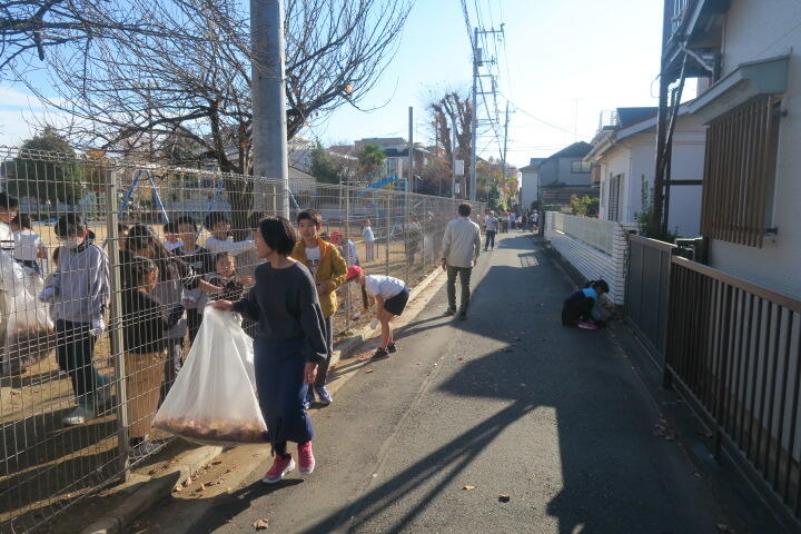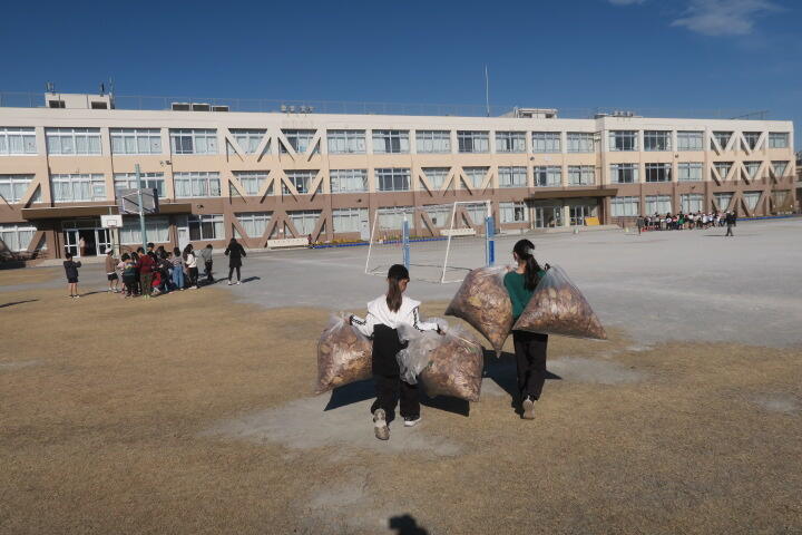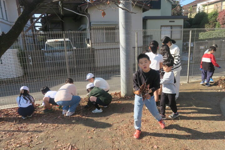 たてわり班ごとに校庭や学校の周りの落ち葉を拾いました。
