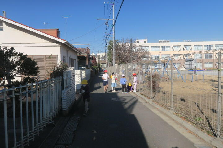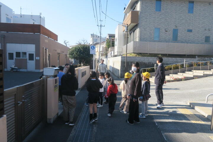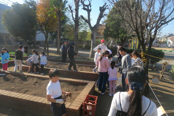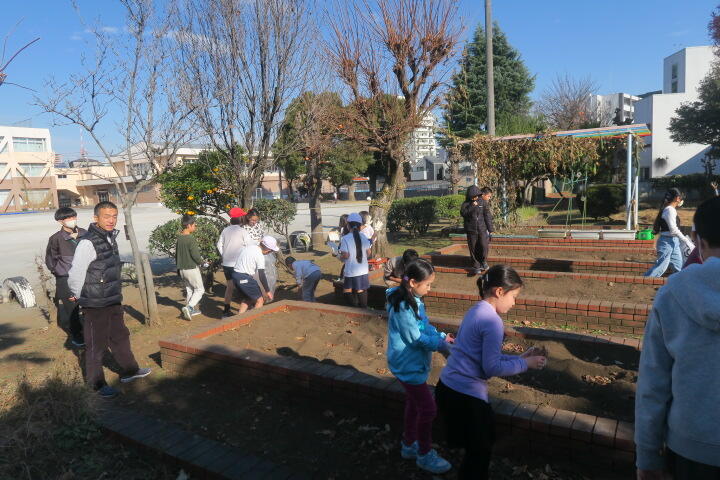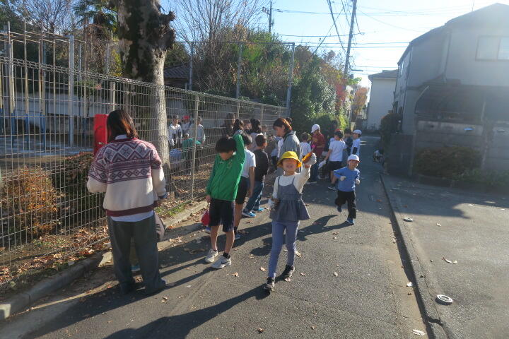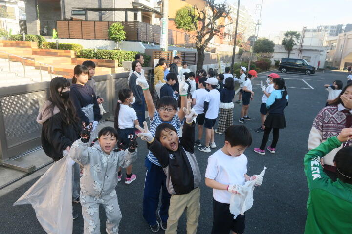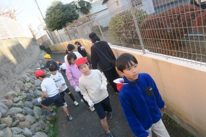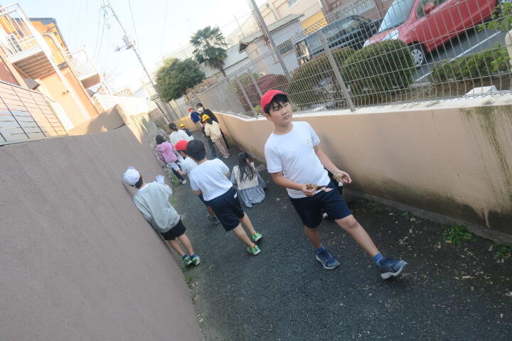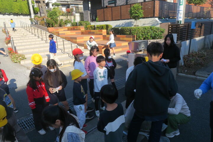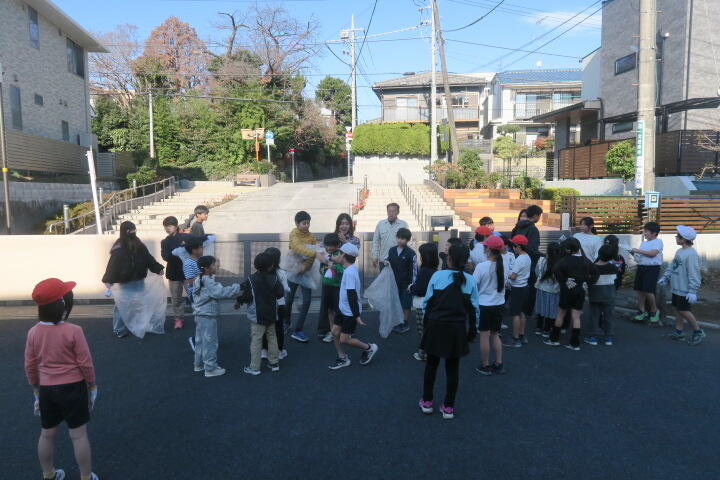 たてわり班ごとに校庭や学校の周りの落ち葉を拾いました。