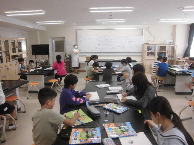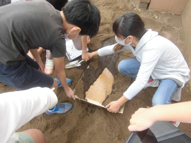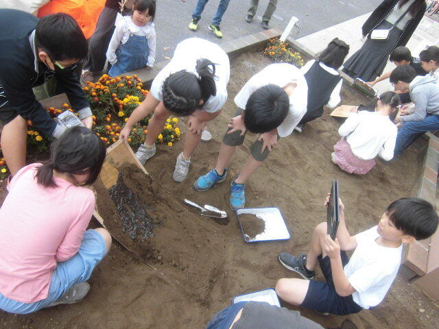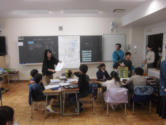 かげを利用して、太陽の動きを見る実験の仕方の説明をしていました。