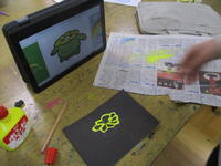 黒い画用紙に描いた絵の上にボンドを乗せ、色を付けていきます。