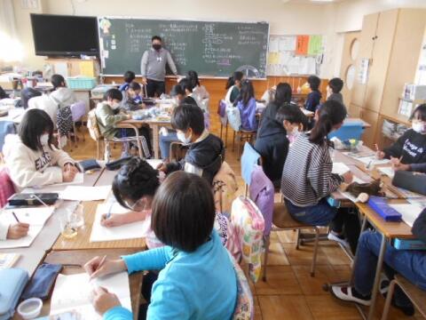 修了式の話を板書(黒板に先生が文字を書く)し、分かりやすく子どもたちに話をする先生!!