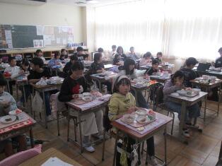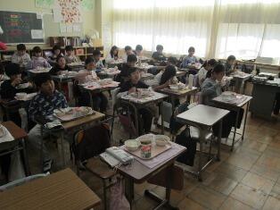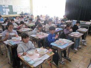 12月8日(月)本日の給食では、飛鳥鍋が提供されました。飛鳥鍋は奈良県の郷土料理です。鶏肉と野菜を牛乳とだし汁で煮込んだ料理です。写真は4年生の様子です。