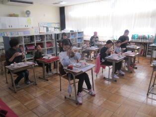 11月21日(金)本日の給食も和食の日献立でした。ごはん・さばの塩焼き・煮びたし・いものこ汁が提供されました。写真はくわのみ学級5年生の様子です。