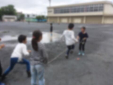 食べた後は元気いっぱいに校庭で遊ぶ子どもも。水たまりを上手に避けながら遊んでいました。