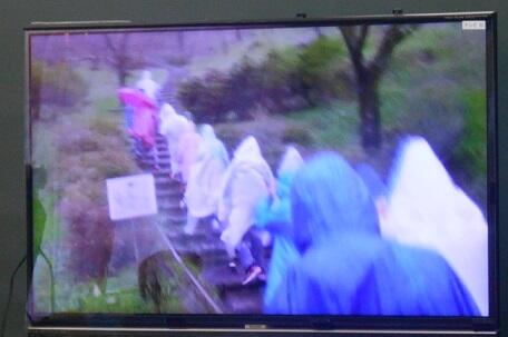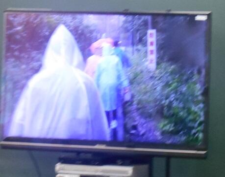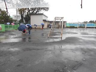 すごい雨なので、急きょ青梅一小の体育館をお借りして