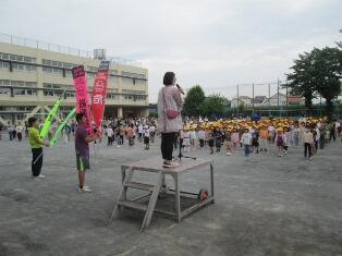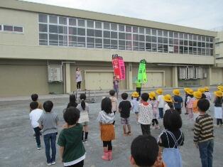 5月27日(月)全校朝会がありました。養護教諭が熱中症対策についての指導と警戒を示すのぼりの紹介をしました。