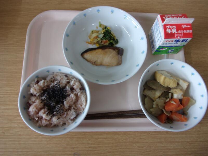 赤飯 ごま塩 ぶりの照り焼き 生揚げの味噌煮