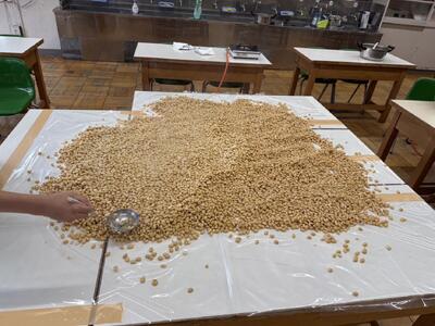 ゆでたインゲンやにんじんとえのきだけをベーコンに巻くのに苦労していましたが、自分の分は自分で巻いて、焼くところまで一人一人が頑張っていました。