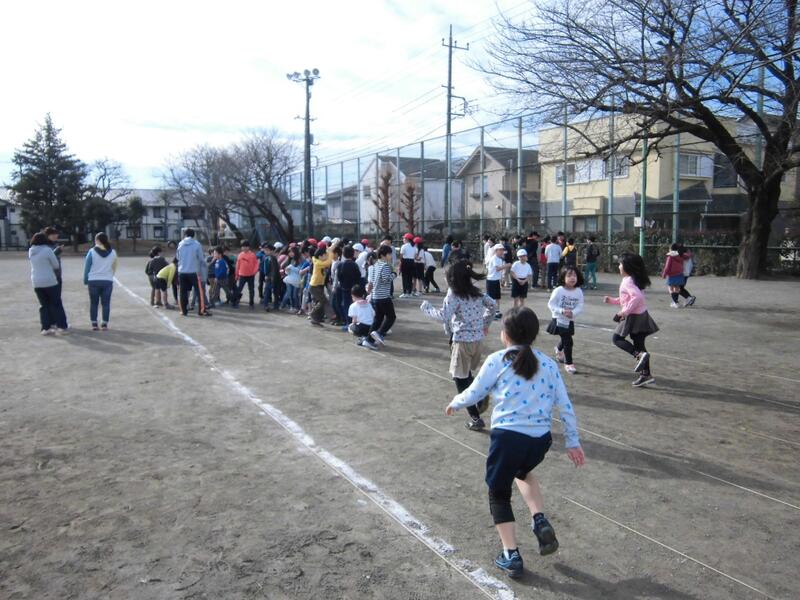 各クラスが一斉に跳び始め、3分間でどのくらい跳べたか、以前のクラス記録と比較し、練習の成果を確かめます。