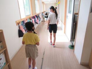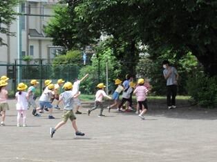 学校の近くにある西砂保育園の園児たちが、避難訓練として学校に歩いて避難してきました。小学校は近隣の幼稚園や保育園とも連携して活動を行うことを進めています。