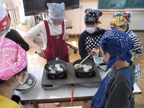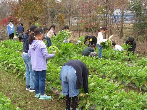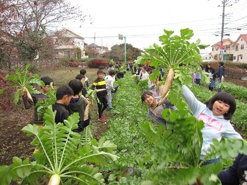先日、9月に中里さん他10数名の地元農家さんにご協力いただき種をまいた大根を収穫しました。収穫した大根を使って、行事スタッフの保護者の皆さんのご協力により、今日から各学級で大根パーティーです。家庭科は、5年生から授業がありますが、一足早く家庭科室での学習です。