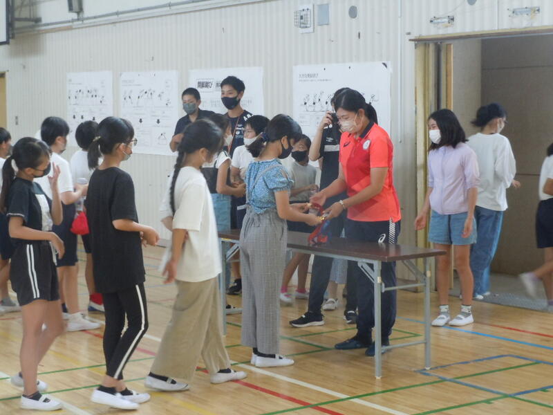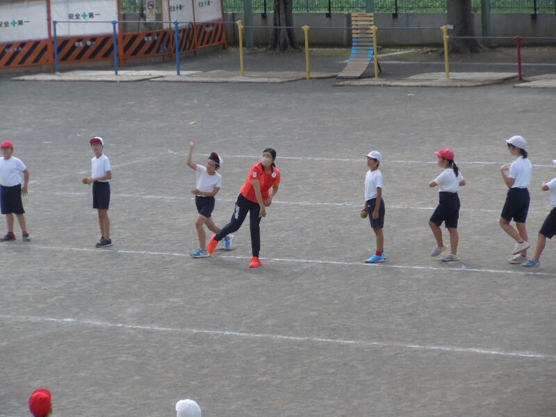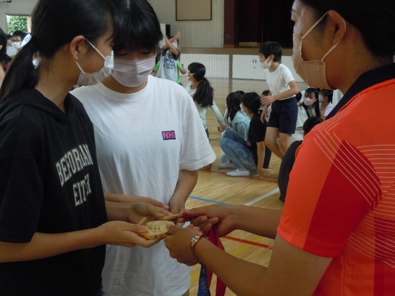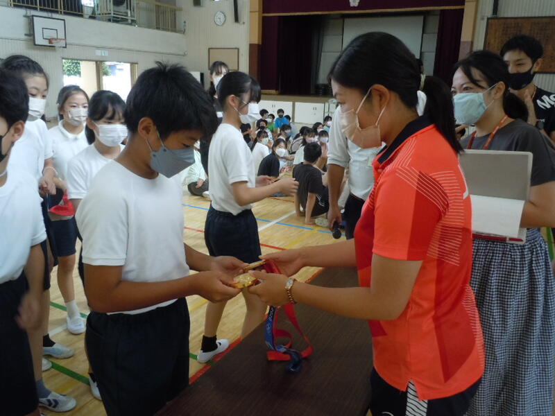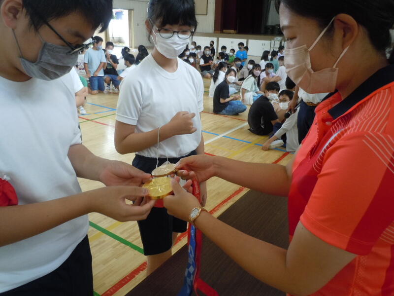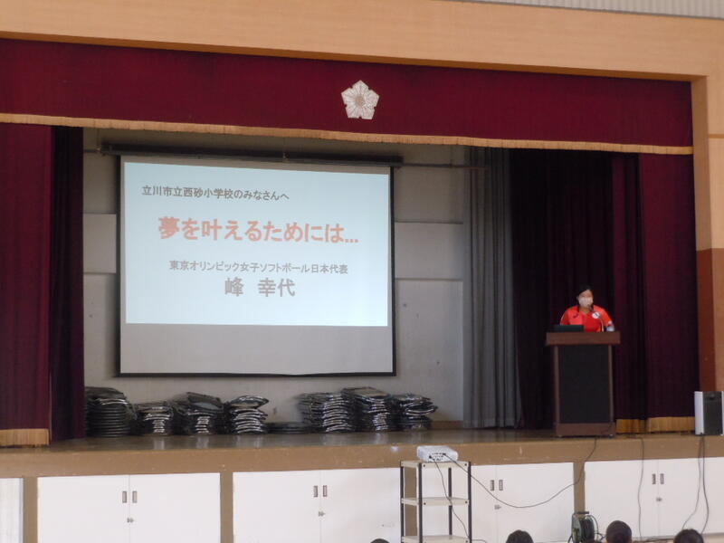 北京・東京オリンピックでソルトボール金メダリストの峰幸代選手に来ていただき、ソフトボールを通じて「夢を叶えるためには」の講演と実技を指導していただきました。2つの金メダルを実際に触らせていただき、子供たちは大興奮でした。金メダルはやはり重かったです。もう2度と触れないかも。等の感想がありました。